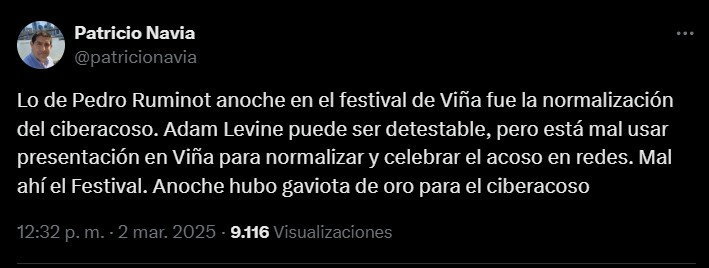“Lo de Pedro Ruminot anoche en el Festival de Viña fue la normalización del ciberacoso”, comenzó señalando el cientista político en su cuenta de X. “Adam Levine puede ser detestable, pero está mal usar una presentación en Viña para normalizar y celebrar el acoso en redes sociales. Mal ahí el Festival. Anoche hubo gaviota de oro para el acoso”, expresó.