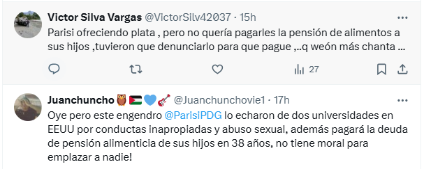 Ante eso, de inmediato llegaron los que recordaron la pensión alimenticia pendiente de Parisi a sus hijos, y le propusieron al candidato “telemático”, pagarla en lugar de ofrecer test de drogas: