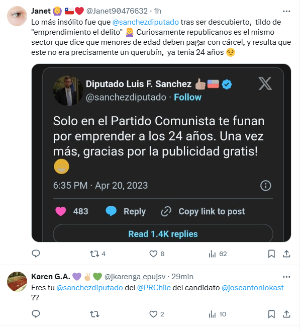 El diputado Luis Sánchez fue sacado a la luz pública en abril de 2023 por un “antiguo emprendimiento” que él mismo comentó en Twitter en enero de 2012, cuando tenía 24 años. En aquel mensaje él ofrecía “importar cigarros de Argentina más baratos” para Viña del Mar, Valparaíso y Santiago, lo que muchos usuarios de redes sociales interpretaron como una oferta vinculada al contrabando de cigarrillos, es decir introducir productos al país sin cumplir con las normativas legales ni pagar los impuestos correspondientes.