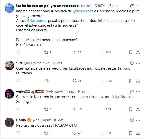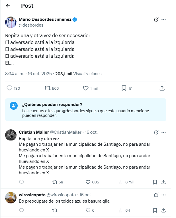 El Alcalde Mario Desbordes, se mandó un grito de campaña que en su posición de alcalde, no pudo ser más imbécil. La pseudo arenga, terminó explotándole en la cara y no es casual, muchos santiaguinos ven la comuna en un estado de abandono absoluto. Acá la estupidez: