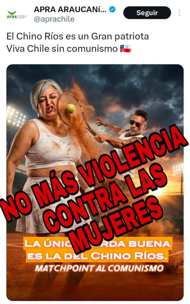 La polémica estalló cuando APRA difundió una gráfica hecha con IA donde se representa al extenista Chino Ríos en un acto violento contra la candidata Jeannette Jara. En la imagen se insinúa un golpe con raqueta, acompañado del mensaje que celebra la acción como un gesto “patriota”. La publicación desató críticas transversales por trivializar la violencia con un montaje digital.