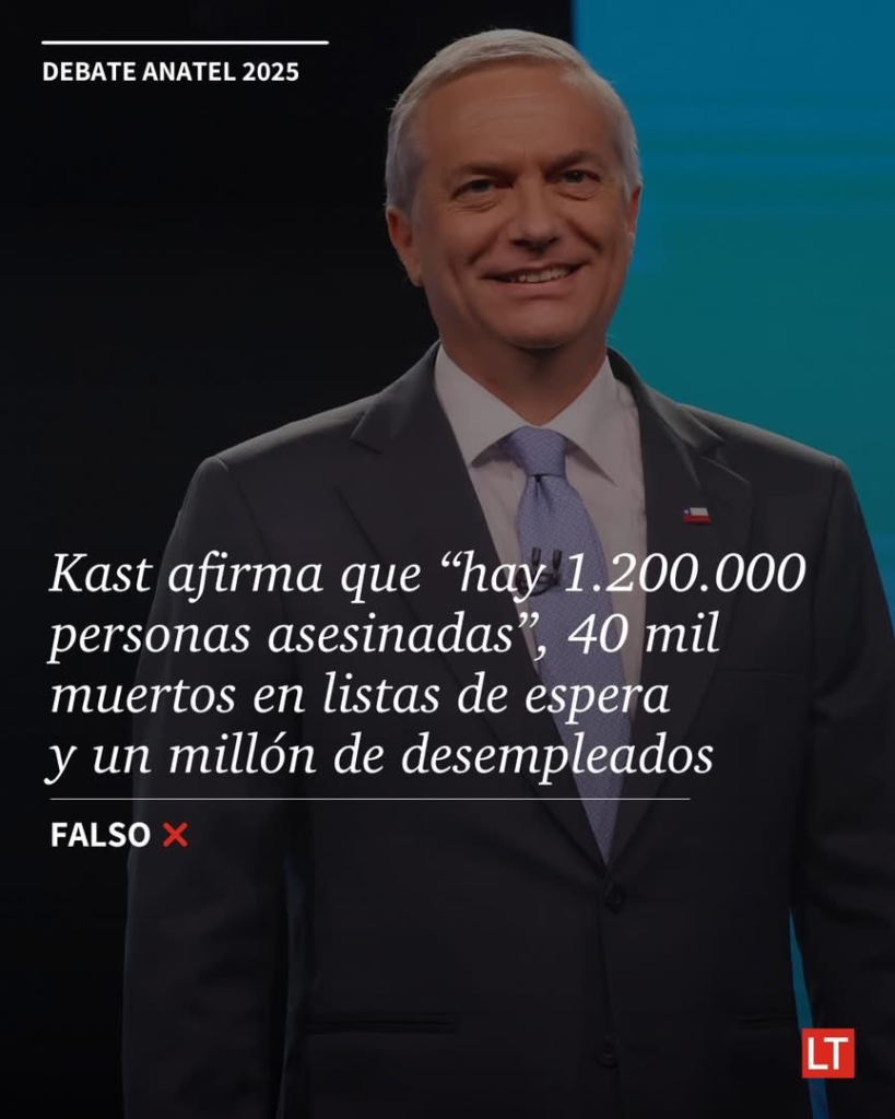 Durante el debate, mientras los candidatos cruzaban argumentos, el equipo de verificación de datos de La Tercera comenzó a publicar en directo una serie de aclaraciones frente a afirmaciones realizadas por Kast. Desde cifras de seguridad nacional hasta números económicos desorbitados, el medio puso en pantalla datos oficiales que contradecían lo expuesto por el candidato, generando inmediata repercusión en redes sociales.