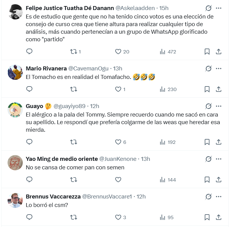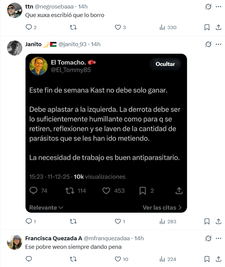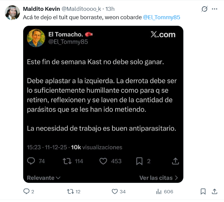 La frase del joven del clan Aylwin —“Kast no solo debe ganar SINO QUE TAMBIÉN APLASTAR A LA IZQUIERDA…”— encendió al instante una polémica que se propagó como incendio en redes. Su apoyo frontal a José Antonio Kast desató una marejada de reacciones que no tardaron en recordarle el peso de sus palabras. Entre críticas, ironías y pantallazos que circulaban por todos lados, el mensaje terminó desapareciendo de su perfil, aunque ya era demasiado tarde: la galería alcanzó a dejarle varios recados que todavía siguen dando vueltas.