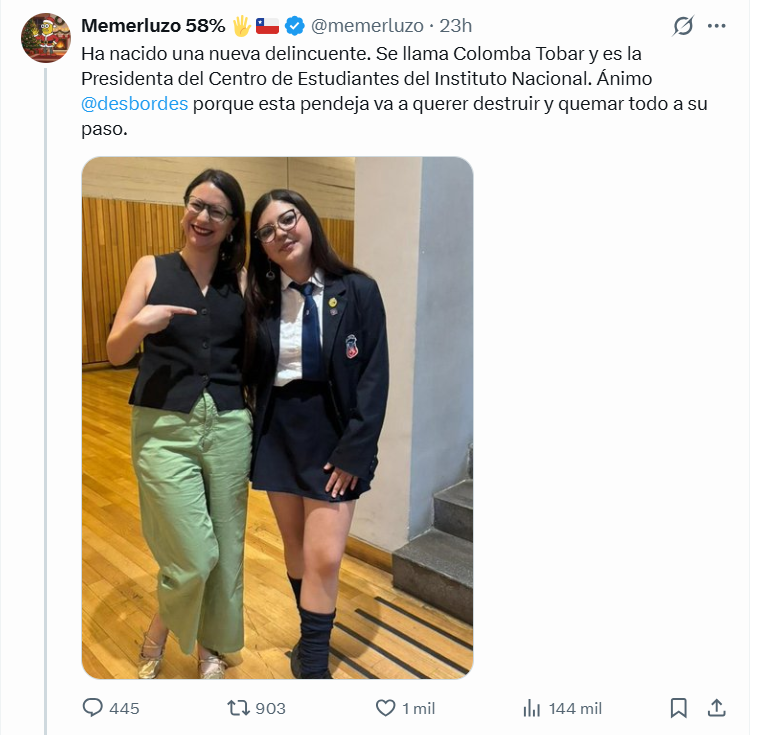 Una publicación atribuida a una cuenta ligada a la ultraderecha generó polémica en redes sociales luego de difundir la imagen de una estudiante del Instituto Nacional. En el mensaje, la cuenta realiza acusaciones sin respaldo, menciona al alcalde Mario Desbordes y fue duramente cuestionada por exponer a una menor sin autorización.