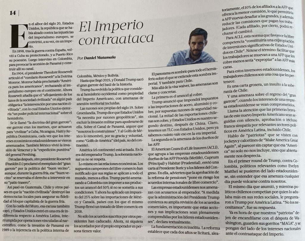 En su columna, Daniel Matamala analiza el regreso de la política imperialista de Estados Unidos bajo la presidencia de Donald Trump, quien ha revivido las estrategias del siglo XIX, como la intervención directa y la amenaza de anexión de territorios, como Groenlandia.